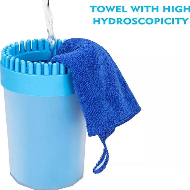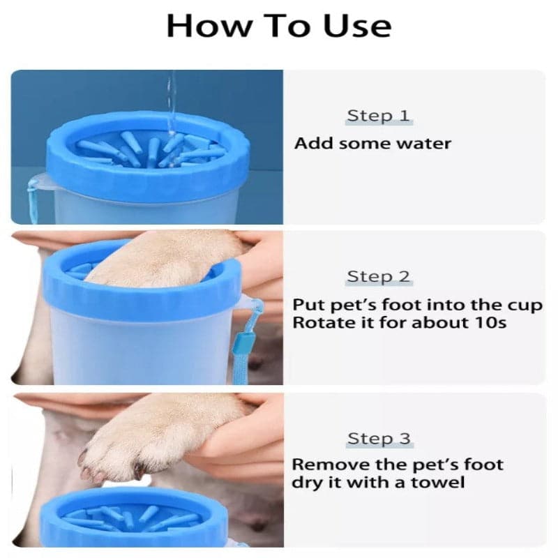 Sólo hay que añadir agua al vaso, insertar la pata sucia y rotar suavemente. Luego, solo debes secar la pata de tu perrito y botar el agua sucia.
