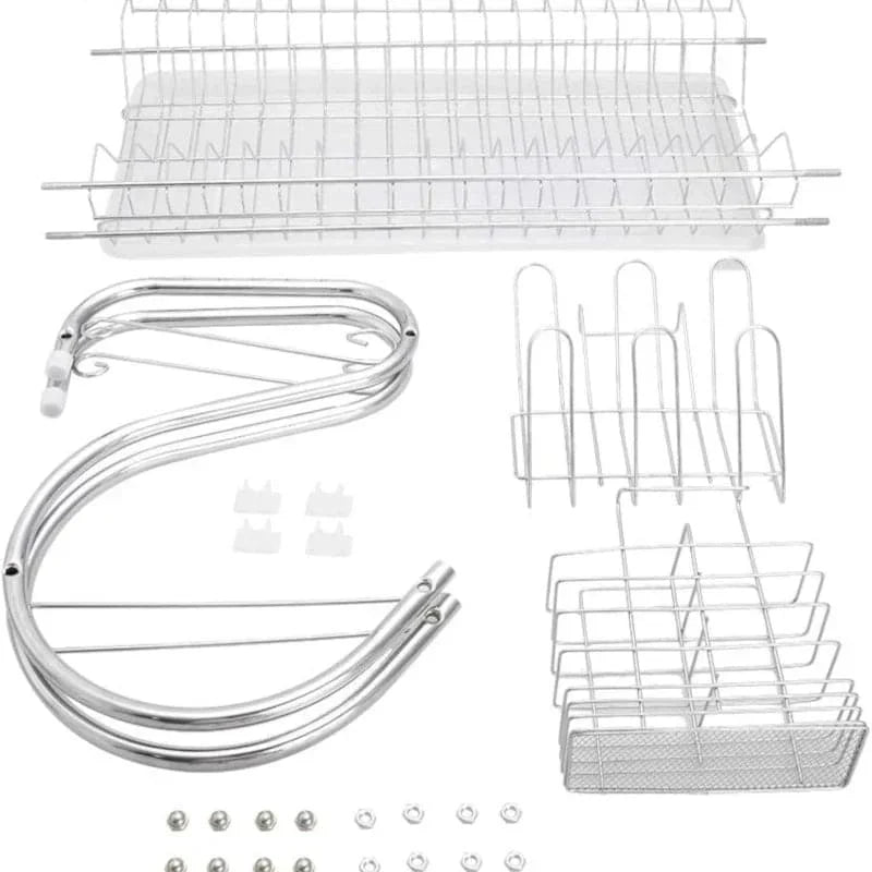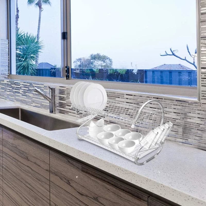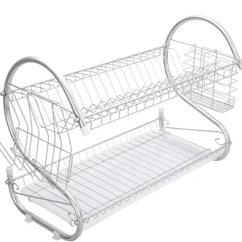 Este escurridor no solo es útil para secar platos, sino que también es ideal para mantener tus utensilios organizados. El nivel superior es perfecto para vasos y copas, mientras que el inferior acomoda platos y cuencos. La bandeja de goteo incorporada evita que el agua se acumule en tu encimera, manteniendo tu cocina limpia y seca.