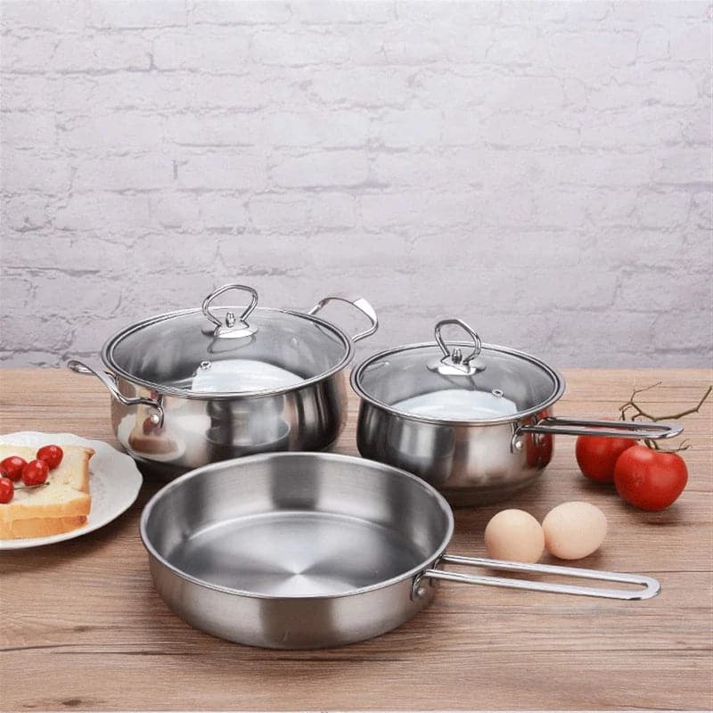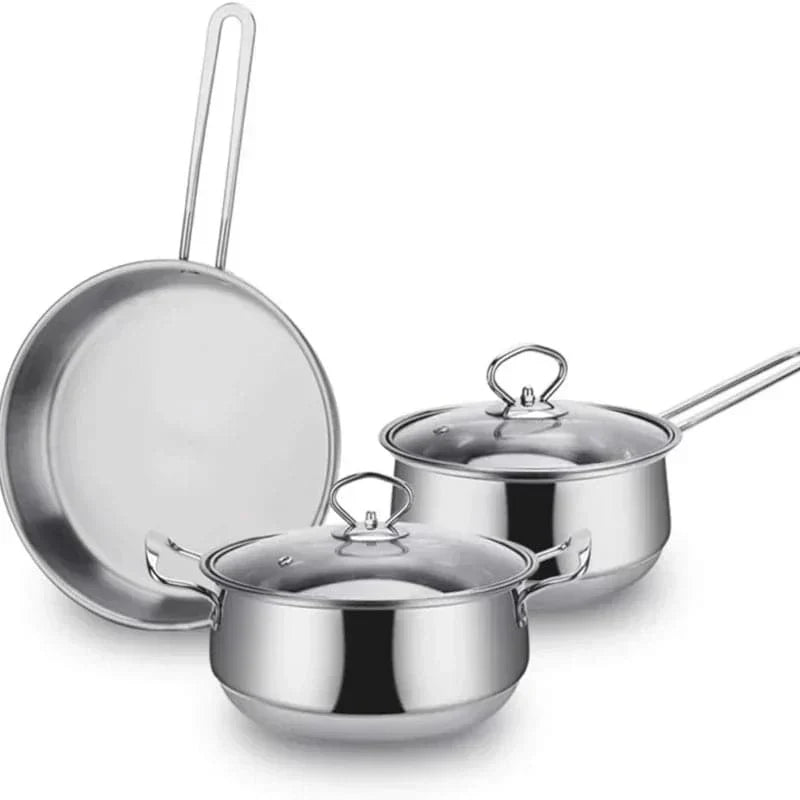 Cocina con estilo y durabilidad: Juego de ollas y sartenes de 3 piezas de acero inoxidable