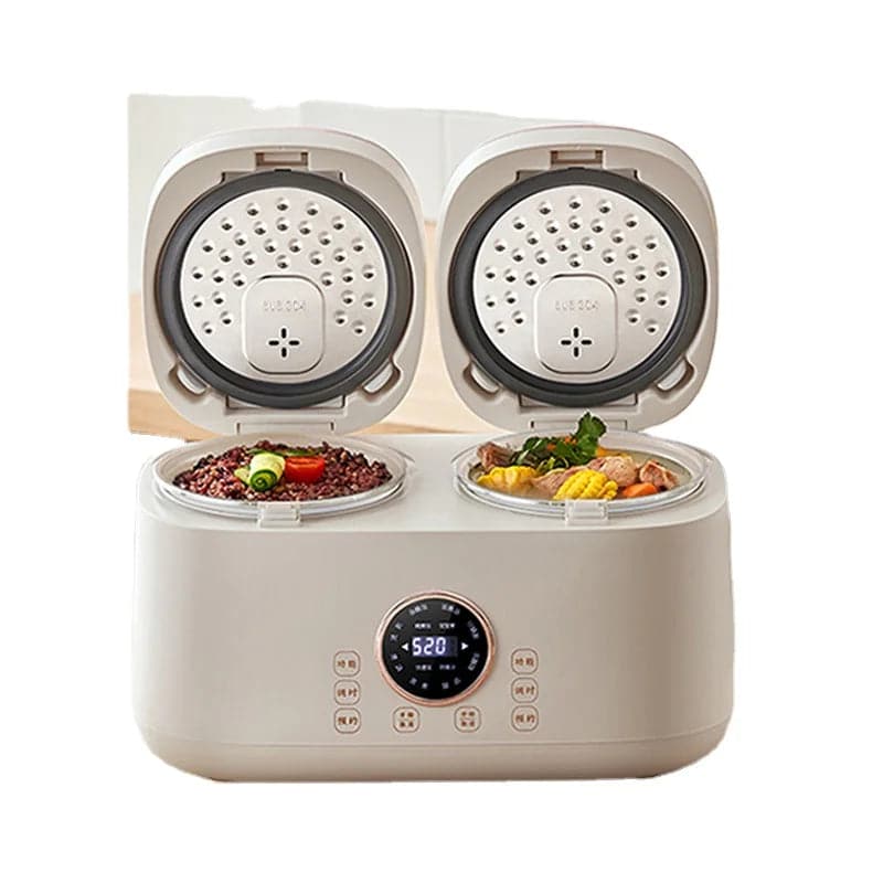 La olla arrocera eléctrica de 2 puestos es la solución definitiva para simplificar tus comidas diarias. Con dos compartimentos separados, puedes cocinar arroz en uno y al mismo tiempo preparar un delicioso plato al vapor en el otro.