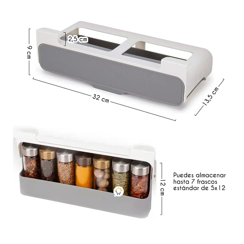 Con este organizador, tus especias estarán al alcance de la mano en todo momento, facilitando tus tareas culinarias diarias. Además, su apariencia elegante y moderna complementará la decoración de tu cocina. Añade funcionalidad y estilo a tu espacio culinario con nuestro organizador de especias con soporte para repisa.
