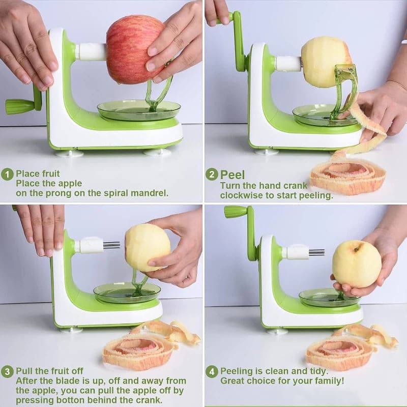 Es muy sencillo y rápido de usar, fije la verdura o fruta en el cabezal de agujas, luego gire la manivela manualmente, en seguida la pieza empezará a girar sobre su eje, mientras que la cuchilla realizará movimientos giratorios a su alrededor para pelarla completamente, y en tan solo 5 segundos no quedará ni un solo milímetro de esa fruta o verdura sin pelar.
