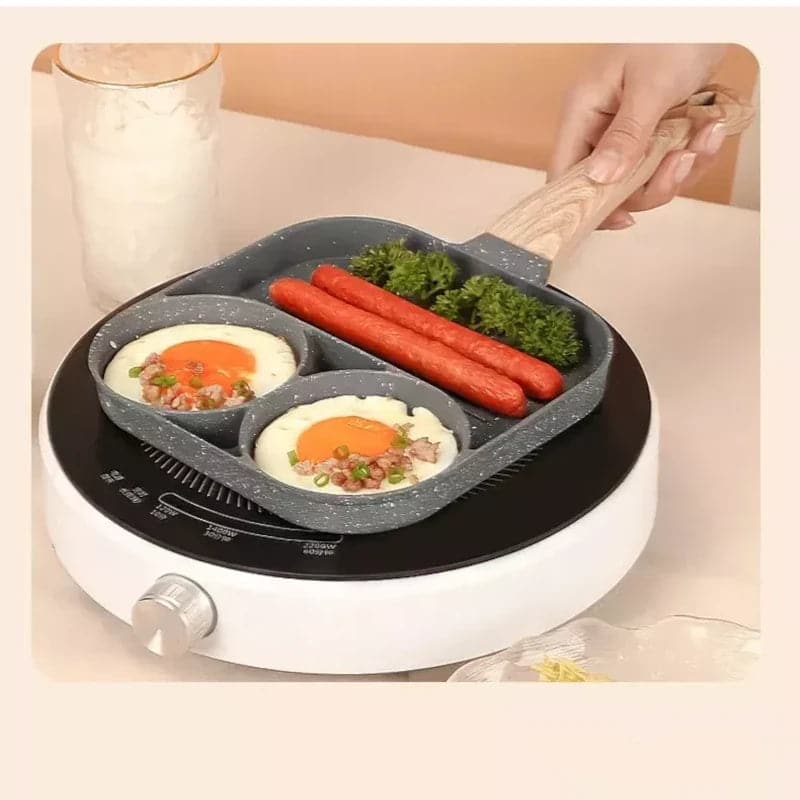 - Equipado con 4 compartimentos, este sartén es tu socio en la cocina rápida y sin complicaciones. Desde huevos al estilo omelette hasta tortillas y arepas, cocinar nunca ha sido tan fácil y eficiente.